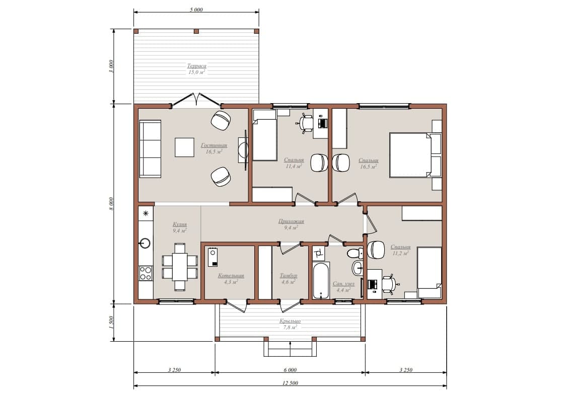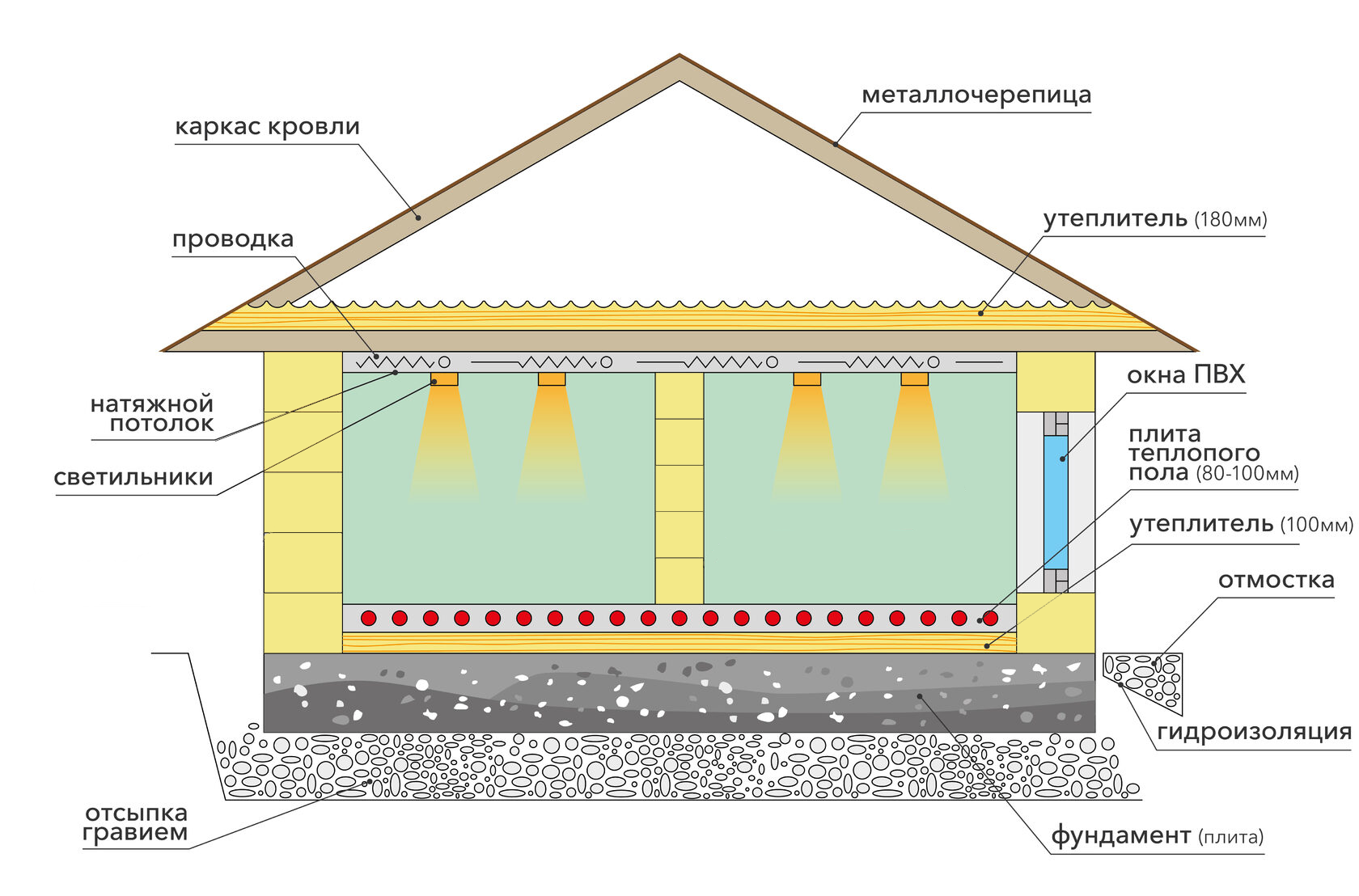 Основа - деревянная стропильная система с огне-био защитой, пароизоляция, ветро/влагозащита. Утепление - межэтажное перекрытие с дополнительным слоем утеплителя. Покрытие дома - металлочерепица